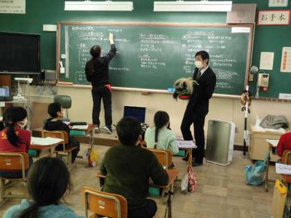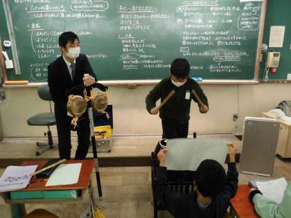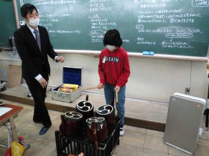「柏野の魅力発見」の学習で,「六斎がある!」と,六斎で活動しておられる方に来ていただいて,体験学習を行いました。