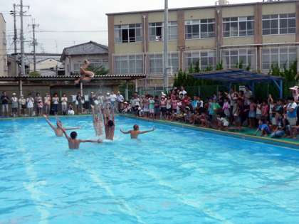 8月1日(月),“INDIGO BLUE”のボーイズシンクロライブを本校のプールで行いました。本校の教職員との関わりで実現したもので,全校登校日に集まった子どもたちだけでなく,保護者や地域の方々を含め150名を超える方々がプールサイドから楽しいシンクロの演技を鑑賞しました。20分間ほどのライブでしたが,子どもたちは興味津津,音楽に合わせて一緒に踊りながら,水しぶきもものともせずに楽しみました。