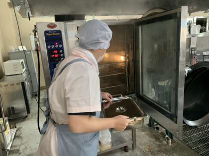 クラスごとに食材と調味料をわけ入れて,スチームコンベクションオーブンで調理しました。