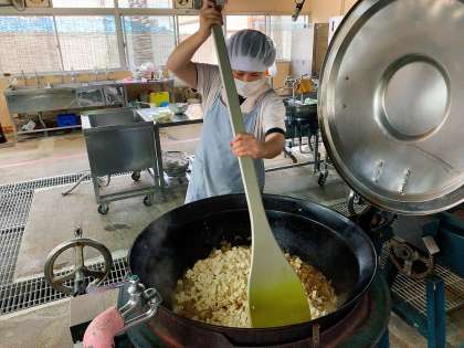 今日はピリッと豆板醤の辛みがきいた『マーボどうふ』でした。給食室にはたくさんの豆腐が届き,調理員さんが一気に豆腐を切っていきます。豆腐がメインの料理の時は,大きめに。みそ汁などの時は小さめに切ります。大きな釜に入れるときも,できるだけ豆腐が崩れないように気を付けながら,調理をしてくださいました。