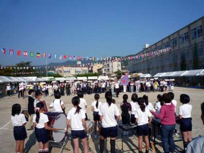 音楽隊は,3〜6年の音楽が大好きな子どもたちで編成されています。開会式でご紹介いただき,区民の皆さんから大きな拍手をいただきました。みんな,少しはにかんで演奏していました。