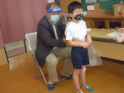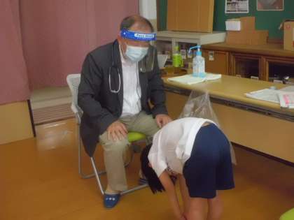 学校医に聴診器をあてて心臓や肺の音を聞いてもらったり,背骨のチェックをしてもらったりしました。受診が必要な場合のみ検診の結果をお渡しします。検診結果を持ち帰られた場合は,専門医の受診の方,よろしくお願いいたします。