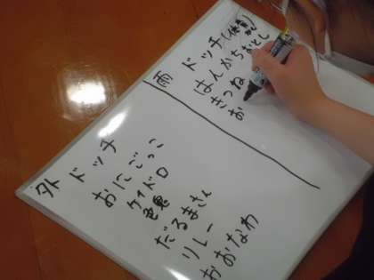 6年生が話し合いをリードし,1年生でもルールがわかり,簡単に楽しく遊べる遊びはどんな遊びがあるかだけでなく,晴れの場合や,雨が降った場合についてもどんどん意見を出し合いました。