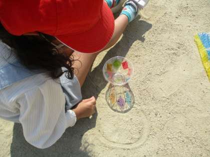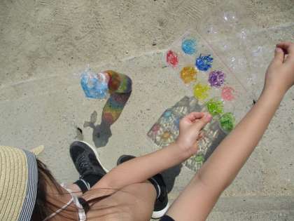 プラスチックの容器やペットボトルに色をつけたり,カラーセロハン紙を使ったりしながら,光に当てるとどうなるのか,「早く光にあてたい!」とワクワクしながら作りました。5月に入ってから,晴れている日が少なかったため,今日ようやく太陽の光に当てることができました。