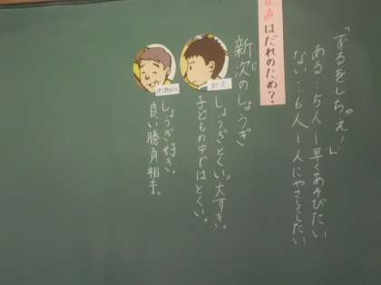 『新次のしょうぎ』というお話から,“ずる”をした時の気持ちを出し合いました。自分の間違いを認め,正直に明るく生活していくの大切さについてみんなで考えました。