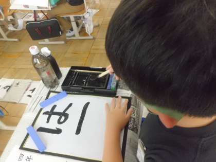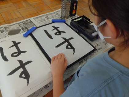 『は』の“横の結び”と『す』の“たての結び”の筆使いの違いに気をつけながら書きました。みんなで話し合い,軽く筆を止めたり,力を抜きながら,ゆっくり方向を変えることがうまく書くことができるコツだと見つけることができました。練習用の用紙で,何回も『は』と『す』の結びの練習をした後,半紙に書きました。
