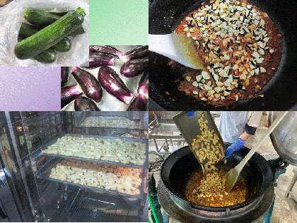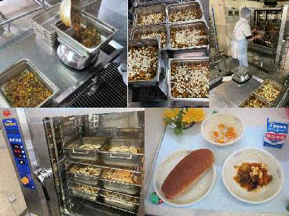 釜で具材を炒め、煮詰めているところに、スチコンで焼いたじゃがいもとチーズを加えて深型のホテルパンに移していきます。