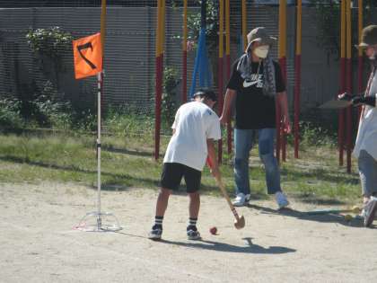 多くの子ども達が初めてのグラウンドゴルフだったので、地域の方に打ち方やルールを教えてもらってから始めました。