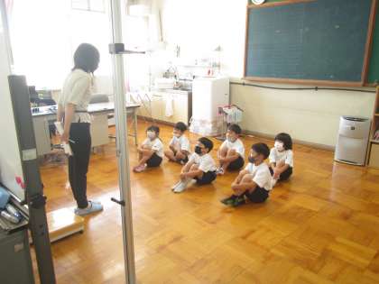 身体計測を実施しました。計測前には、夏休み後の生活チェック表や夏休みに実施した歯みがきカレンダーを振り返りながら、毎日元気に過ごすために気をつけなければならないことを考えました。