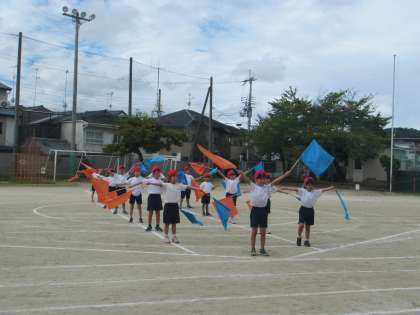 1年生の演技は、オレンジ色と青色の旗を使っての演技です。1年生としては難しい隊形移動にも挑戦しました。