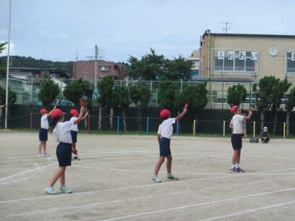 3年生は、鳴子を手に持って演技しました。テンポの速い曲に合わせて、鳴子の音を合わせるのがとても難しく、3年生だけで何度も練習を繰り返しました。その成果か、きょうは鳴子の音がそろって聞こえました。3年生全員の気持ちがしっかりつながっていた証拠だと思います。