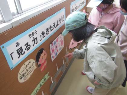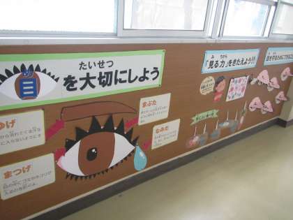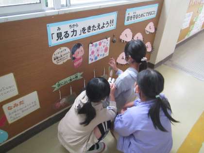 10月10日は、目の愛護デーでした。保健室前の掲示板ではそれに合わせて『目を大切にしよう』をテーマにした掲示をしています。休み時間や放課後になると掲示板の前に子どもたちの姿が。