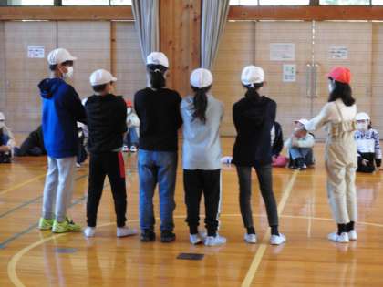 誕生日順に並んで輪になったり,グループで花背山の家の活動で楽しみにしていることを記念撮影風に表現したり,一緒になって楽しく活動しました。