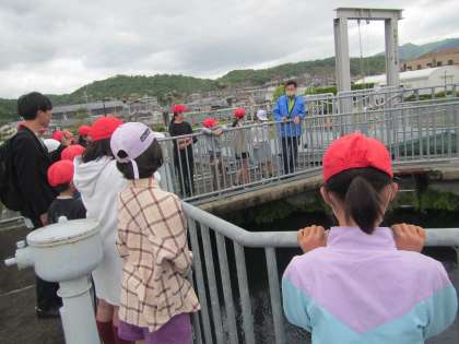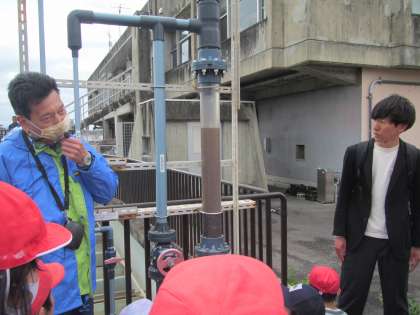 琵琶湖から琵琶湖疏水を通って浄水場にやってきた水は、黒く濁っていてごみが混じっているのが見え、とてもこの水が私たちが飲んでいる水だとは、信じられませんでした。でも、そのごみをかき混ぜたり、沈ませたりして取り除き、さらに砂でろ過(もっと細かいごみをとる)したりして、透明の水にし、薬品で消毒をして、やっと私たちが飲むことができる水になるということがわかりました。子どもたちは、「砂で水がきれいになるの!」ととても驚いていました。また、そのごみが付着した砂の洗浄の様子も見せてもらいました。大量の水と大きな音にますます驚いていました。