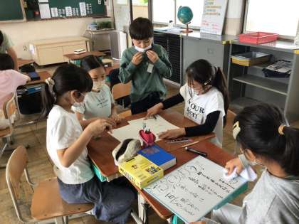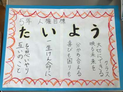 できあがった5年生の人権(学級)目標。その裏側は、自分たちの思いを高学年らしく伝えるために、辞書を使って言葉を調べたり、分担して掲示物を作ったりしていました。