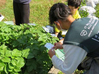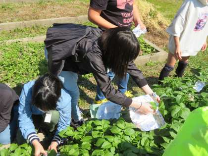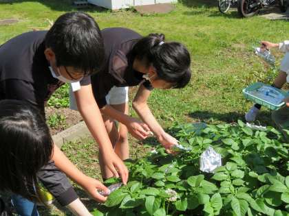 実験に向けてジャガイモの葉にアルミホイルを巻いています。日光が当たる、当たらないとでは変化はあるのでしょうか?実験を通して、新たな発見をしてほしいと思います。