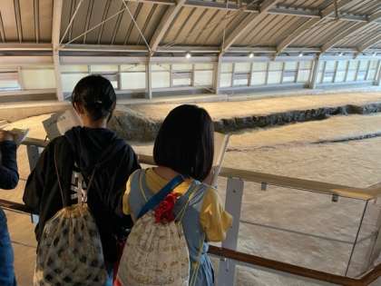 野島断層を見学しています。大きな力で、地面が縦に50センチ持ち上がり、さらに右にずれたそうです。地震の凄まじさが感じられます。子どもたちは皆、熱心にメモを取っていました。