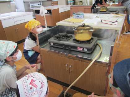 毎日食べているご飯…家庭では、ほぼ炊飯器を使って炊いていると思いますが、ここでは洗い方や給水のさせ方の他に、鍋を使って炊くときの火加減やその時間などそれぞれの場面のポイントについて学習しました。その都度、お米の様子や鍋の中の様子の変化も観察しました。