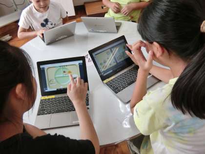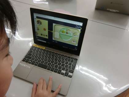 バイキングでどんなものを、どんな量を取るのがよいかをタブレットを使って学習。