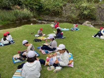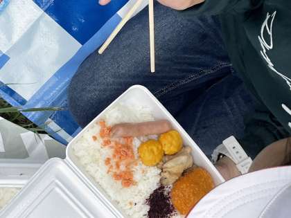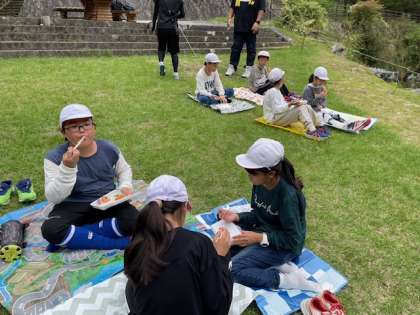 休憩地点のグランドでお弁当を食べています。