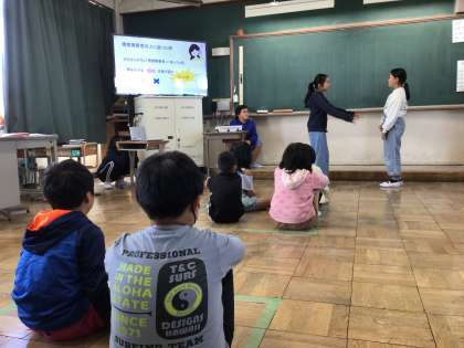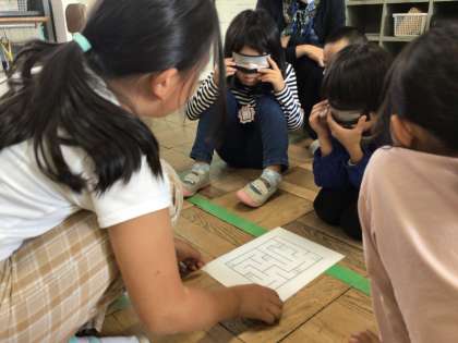 今回のグループは、京都ライトハウスに行って学んだことをパワーポイントにまとめて発表し、視覚障害体験会を行いました。全校の子どもたちからは、「目の見えない方にあったら勇気を出して声をかけたい。」「ただ見えないのではなくて、見え方にもちがいがあるのだと知りました。」などの感想が出ました。