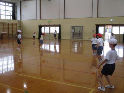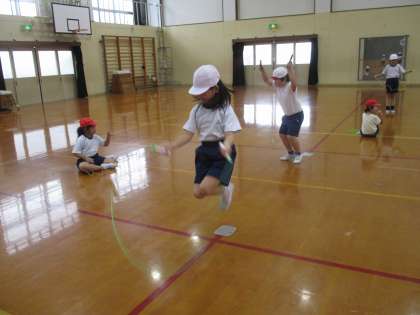 1年生の体育科では「なわとび」の学習をしています。なわとびの回し方や跳び方を学び、まずは1回、跳ぶところから練習を始めました。