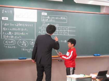 今日の5時間目に、4年生の算数科の校内研究授業を行いました。「変わり方」の単元の、1辺が1cmの正方形を階段のように並べて作った形の、だんの数とまわりの長さの関係を調べる学習をしました。