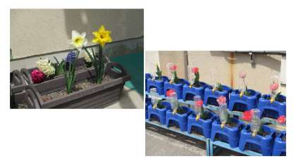 子どもたちが植えたチューリップやすいせん、ヒヤシンスも