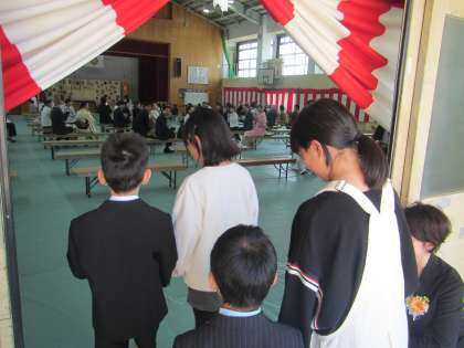 6年生に連れられて体育館に入場する1年生は、みんなドキドキ緊張していました。けれども、校長先生のお話をしっかりと聞いたり、みんなで一緒におじぎをしたりする姿はとても立派でした。