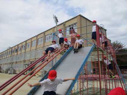 高さや勢いが少し怖かった人もいましたが、楽しく安全に遊具を使うことができました。最初は意識していても、慣れてくる頃が事故が多くなります。体育科の学習の時以外でも、遊ぶときには注意して安全に使っていきましょう。