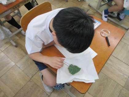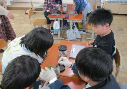 3年生の理科の学習では、モンシロチョウのたまごから育てています。幼虫のえさになるキャベツを交換したり、掃除をしたりして、お世話を頑張っています。早くも、さなぎになった班もあります。「たまご→幼虫→さなぎ…」次はどうなるか楽しみですね。