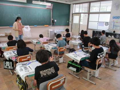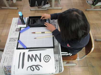 3年生の書写から、毛筆での学習が始まります。初回は、習字セットの中に入っている物の名前を確かめ、使い方を学びました。その後、墨液を入れて墨をすったり、実際に筆に墨をつけて書く練習をしたりもしました。太さを変えたり、縦や横の線を書いたりしながら、初めての毛筆での習字を集中して取り組むことができました。