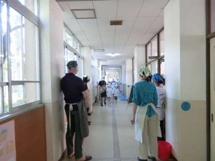 給食についてお話した後、教室で給食の姿を参観していただきました。