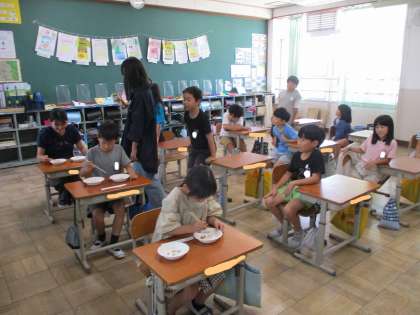 中間休みに、給食委員会の取り組みで「おはし検定」をしました。中学年は「大豆」を「20秒間」で、おはしを上手に使ってお皿からお皿に移し替えます。この1週間、休み時間に練習をしていた人もいました。その練習の成果もあってか…1位は「8個」で、2名いました!みなさんよく頑張りましたね。