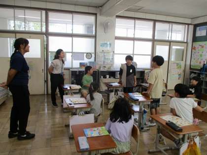 3年生の外国語活動では、2学期から新しい先生が授業に入ってくださることになりました。今日は、新しい先生の自己紹介を聞き、みんなで自己紹介をしました。これまでに習った表現を使って、自分の名前や好きな色などをペアの友達やみんなに伝えることができました。その後は、ALTの先生とも一緒に、カードゲームをしたり、歌を歌ったりして盛り上がりました。これからの学習も楽しみですね!
