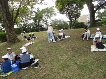 地下鉄の降車駅が違うため、昼食は鴨川河川敷で柏野小学校のみんなで食べました。保護者の皆様、朝早くからお弁当の準備など、ありがとうございました。