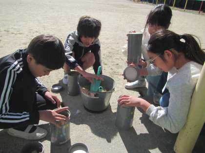 科学センターからお借りした道具を使い、れき・砂・どろに分ける実験を行いました。つぶの大きさを見比べる中で、それぞれの違いに気が付くことができました。今後も実験や観察を行い、地層のしま模様について調べていきたいと思います。