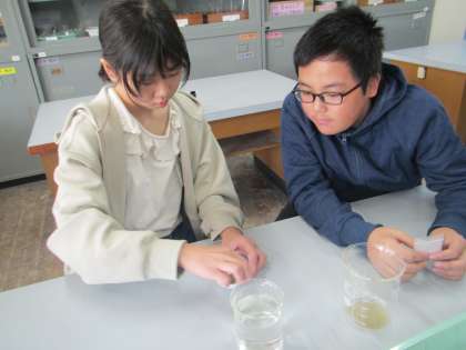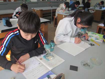 双眼実体顕微鏡を使って、火山灰の粒を観察しました。大きさや形、色の特徴などについて気付きを交流しました。
