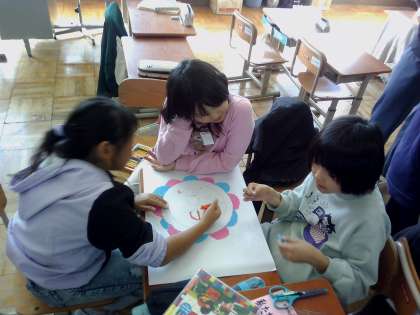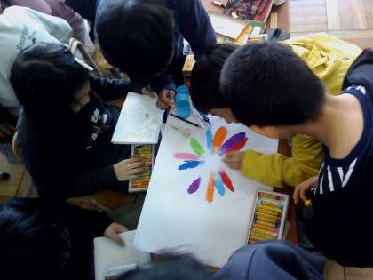 4年生は学習発表会で「ありがとう」を伝えていきます。今日は、「ありがとう」を伝えることで咲く花をグループで描きました。すてきな花がたくさんできました。