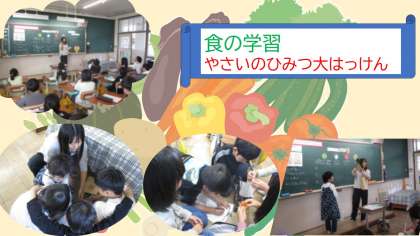給食時間には、野菜をしっかり味わって、学んだことをたしかめていました。