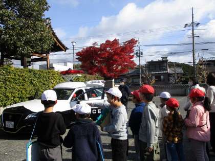 警察官の方のご協力により、交番の中を見せていただき、装備の紹介やパトカーの体験までさせていただきました。子どもたちも、初めて見る道具やパトカーに目を輝かせながら、インタビューする姿が見られました。今回の見学を通して、お世話になっている警察官の方が身近に感じられましたね。毎朝、登校の見守りをしてくださっているので、これをきっかけに挨拶をしたり、お話をしたりしてほしいと思います。