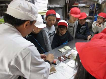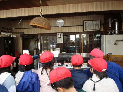 町探検、後半は校区の和菓子屋さんの「寿菓舗」さんに行きました。お店の中に入らせていただき、原材料や和菓子を作る機械も見せていただきました。