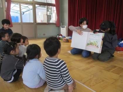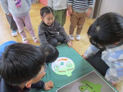 今日、給食委員会の5・6年生が翔鸞幼稚園に訪問し、食べ物福笑いやお箸の持ち方体験、食に関する絵本の読み聞かせをしました。どのような取り組みをしたら楽しんで食に親しんでくれるのかメンバーで考えて臨んだため、園児が楽しそうに興味を持って過ごしてくれているのを見て、委員会のメンバーも嬉しそうでした。