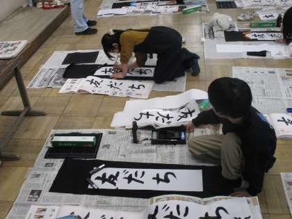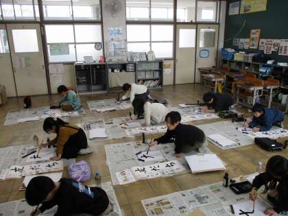 3年生最後の書写の学習では、画仙紙に「友だち」という文字を書きました。今までとは違い、床で書く書き方を新しく試してみました。これまでに学習したことを思い出しながら、集中して画仙紙に書くことができていました。4年生になっても、この調子で頑張ってくださいね!
