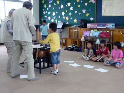 中高学年では,すでに保存会に参加して活躍している子どもたちもいます。今年も千本六斎の保存会の方々にお世話になり,地域の文化「六斎」について学んでいきます。さっそく,笛や太鼓に分かれて練習を始めました。