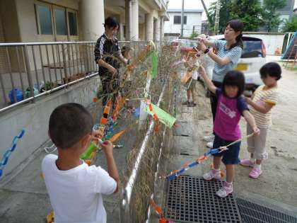 学校では,今日,1・2年生が七夕飾りをしました。子どもたちは,大きな笹2本に願い事や飾りをいっぱいつけました。外からも見えるように,東の渡り廊下の柱にくくりつけました。ぜひ見てください。