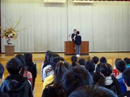 校長先生からは,今年一年間,みんながよくがんばったこととその成長ぶりを褒められました。そのあしあとが,みんながこれからもらう通知票に集約されているので,大切にしようというお話がありました。また,地域から寄付していただいたジェットヒーターのおかげで,昨日の卒業式とこの修了式があたたかい体育館で行えることも紹介されました。式後,いろいろな場面でがんばったたくさんの子どもたちの表彰が行われました。