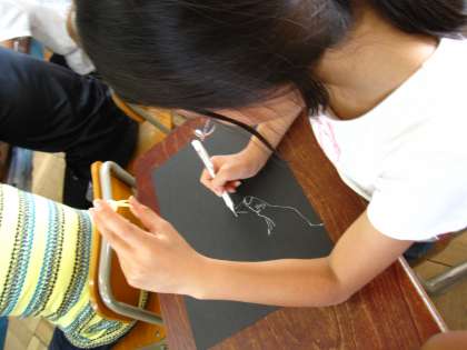 いつもとは違い,黒の中に映える白い線の美しさを語っていました。いつものスケッチ・ペンとはまた違う,線のしなやかさを表現できました。