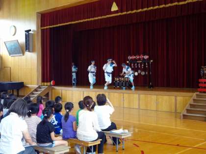 9日(日),3・4校時には,PTAの第1回家庭教育学級を兼ねて,千本六斎会の方々による重要無形民俗文化財「千本六斎念仏」の鑑賞会を行いました。部活動六斎の子どもたちも何人か出演し,太鼓を披露しました。