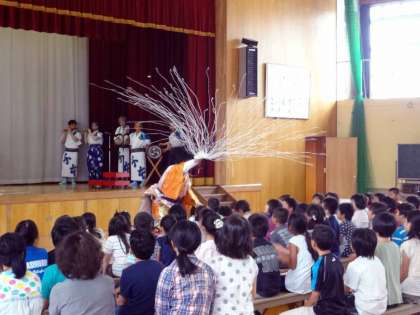 子どもたちは,いろいろな太鼓のたたき方や獅子舞の動きにしきりに感心していました。また,最後の蜘蛛の糸には大喜びでした。この地域の貴重な伝統文化が子どもたちに引き継がれていくことを願ってやみません。千本六斎会の皆様,ありがとうございました。